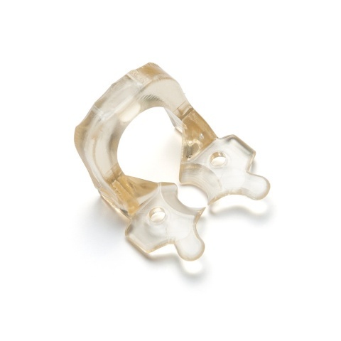 Klamra do koferdamu wykonana z termoplastycznego i przezroczystego materiału, odporna na wysokie temperatury autoklawu, wykazuje niski kontrast na RTG, pomaga utrzymać koferdam w stabilnej pozycji obok zębów.