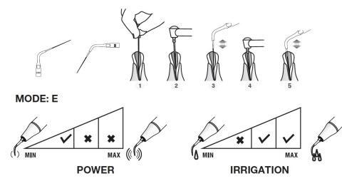 Włóż końcówkę do kanału korzeniowego, staraj się nie napinać końcówki, uruchom urządzenie na 20 sekund, a następnie zatrzymaj się, aby oczyścić kanał korzeniowy. Pamiętaj, kanał korzeniowy musi być nawodniony 3×20 sekund. Zalecana żywotność: 30 ~ 50 kanałów korzeniowych